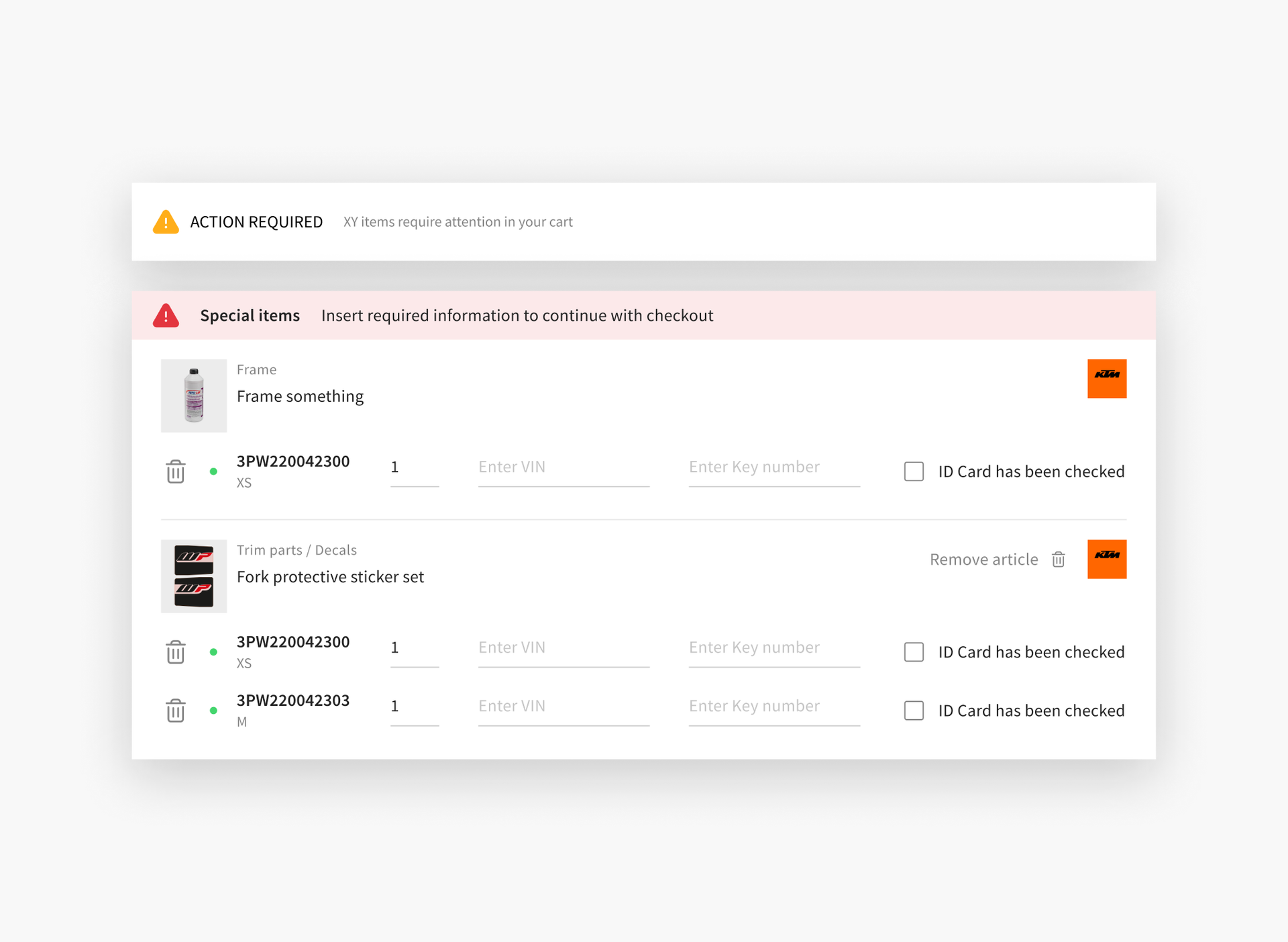 Alle Ersatzteile, Accessories und Merchandise von KTM, Husqvarna Motorcycles und GASGAS in einer Suche, einem Interface und einem Warenkorb.